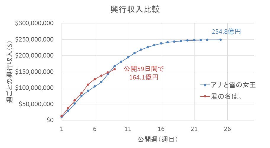 ベルカーブ On Twitter 君の名は が絶好調で興行収入200億円を超えるかもしれないというニュースhttps T Co Cbpgrhp7ds を見て 早速興行収入の推移をグラフから確認してみました アナと雪の女王の国内最終興行収入が250億円ちょっとだったので アナ雪と比較し